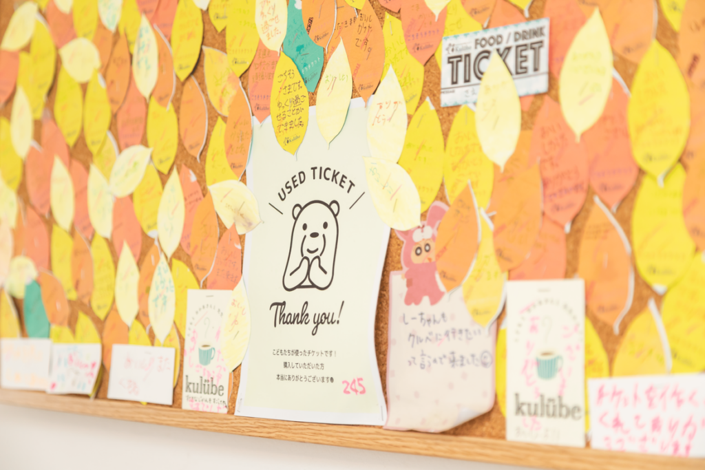 ごちそうチケットは葉っぱの形になっており、店内にはたくさんの人の思いが芽吹いていた。使用済チケットには、活用した子どもからの感謝の気持ちが綴られている。