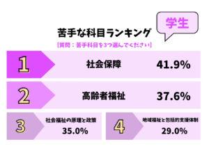 アンケート結果で一番苦手な科目だった「社会保障」は,平均得点率が低めではありますが,得点率ワーストランキングには入っていませんでした.その年の難易度にもよりますが,対策がとれる科目と捉えることができるでしょう.