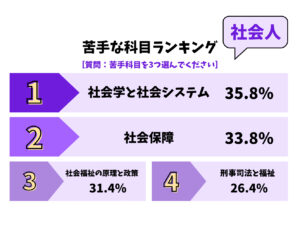 一方で,社会人の皆さんは,「社会保障」よりも「社会学と社会システム」の方を苦手に感じているようです.