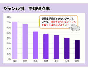 受験生の皆さんが苦手意識をもちやすいジャンルが低い平均得点率となっていることが確認できますが,効率的な試験対策としては,平均得点率が低いジャンルで点数アップを狙うよりも,みんなが得点できるジャンルで取りこぼさないことがポイントです.