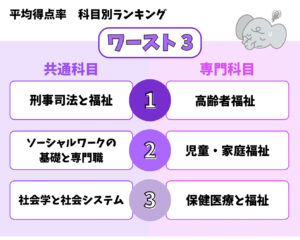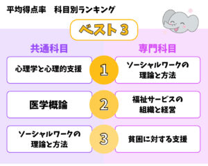 毎回,科目ごとの難易度が変化するため,平均得点率の科目別ランキングは変動しますが,「心理学と心理的支援」と「ソーシャルワークの理論と方法」は,これまでの国試でも平均得点率が高い科目です.